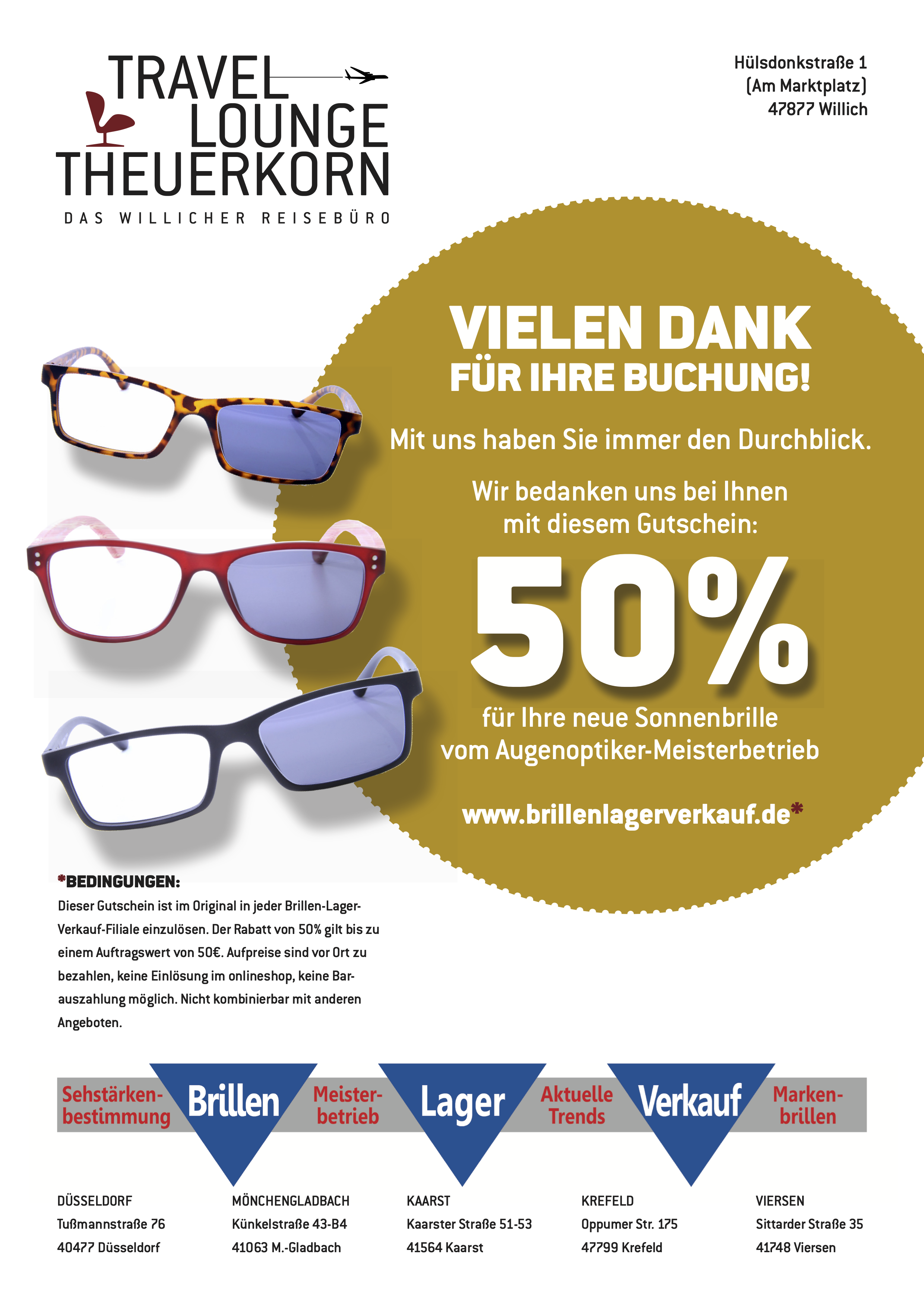 Bei Buchung bedanken wir uns mit einem Gutschein für Ihre nächste Brille In der Travellounge Theuerkorn pflegen wir gerne gute Kontakte. Deshalb stehen wir Ihnen bei Buchungen in unserem Reisebüro ...